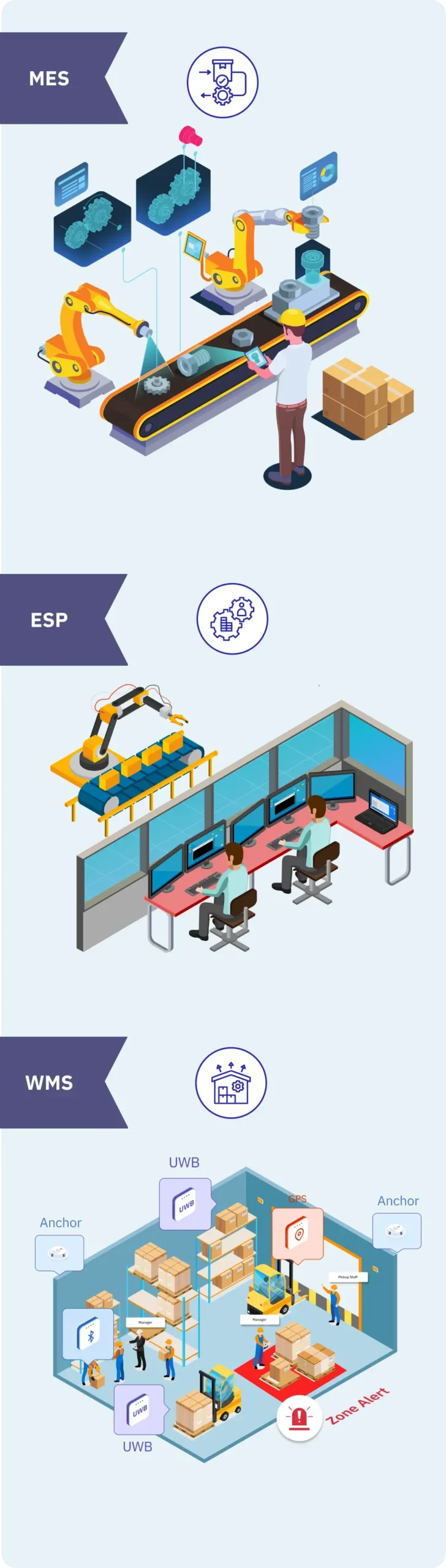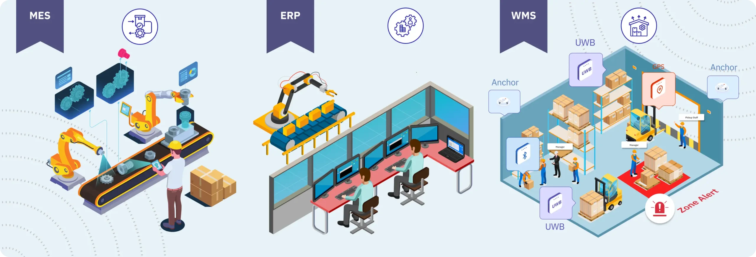 In a large manufacturing plant, there’s no one-size-fits-all tracking technology. Different zones have different accuracy needs, and SyTrak supports multiple location technologies to give you the right balance between precision, coverage, and cost.