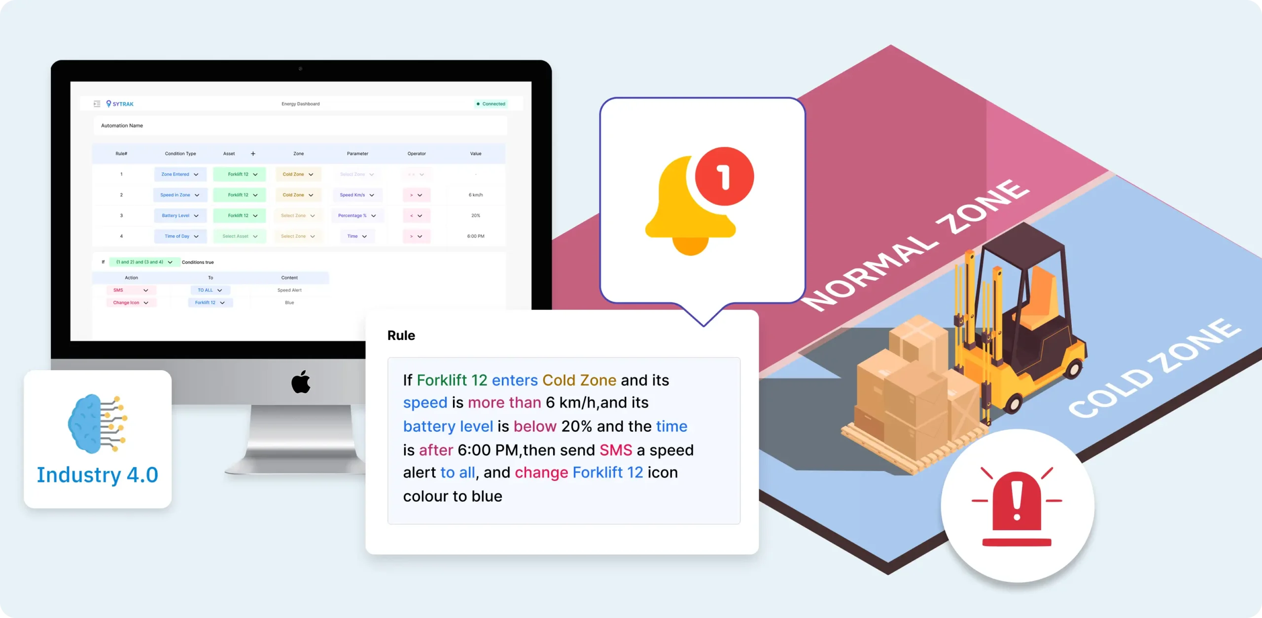 “If the forklift valve enters a cold zone and its speed is above a threshold, and its battery level is below a threshold, and the time is after 6 PM, then send an alert SMS to all or change the forklift icon to blue.”